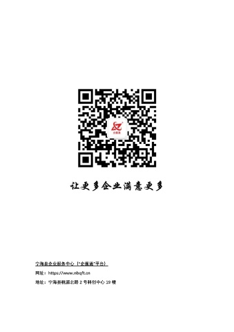 宁海县企业服务中心(“企服通”平台) 网址:https://www.nbqft.cn 地址:宁海县桃源北路 2 号科创中心 19 楼